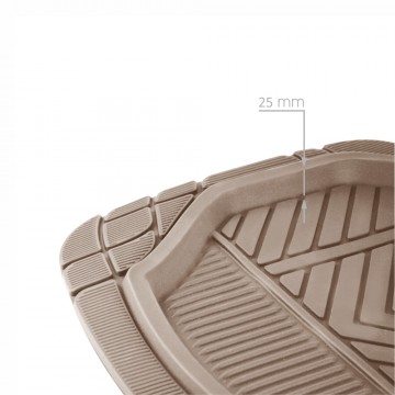 Комплект ковриков можно использовать в большинстве современных легковых автомобилей. Широкая универсальность обусловлена специальным рисунком ковриков. На их поверхности имеется разветвленная сеть насечек для разреза, которая позволяет придать коврикам форму, точно соответствующую днищу салона автомобиля.