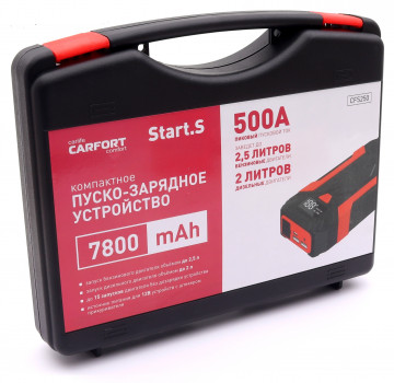 Компактное пуско-зарядное устройство Carfort Start.S CFS250 предназначено для запуска бензиновых двигателей объёмом до 2, 5л и дизельных до 2 л. Обеспечивает до 15 запусков двигателя без дозарядки устройства. Также служит источником питания (пауэр-банком) для мобильных устройств - телефонов и ноутбуков различного напряжения. Carfort Start.S CFS250 поставляется в удобном пластиковом кейсе с ручкой. Теперь никакие переходники и провода не потеряются.